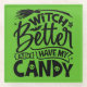 This Halloween-themed design features the playful phrase "Witch Better Have My Candy" arranged in a dynamic, mixed-font layout. The word "Witch" is displayed in bold, blocky letters, while "Better" is written in a cursive, flowing script, adding a sense of urgency and fun to the design. The phrase "Have My" is enclosed within a banner, further emphasizing the demand. The word "Candy" stands out at the bottom in large, block letters, with small skull illustrations integrated into the design. Additional Halloween elements, such as a witch's broomstick, a bat, a star, and wrapped candy, are scattered throughout the composition, enhancing the spooky and festive feel.