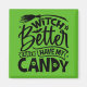 This Halloween-themed design features the playful phrase "Witch Better Have My Candy" arranged in a dynamic, mixed-font layout. The word "Witch" is displayed in bold, blocky letters, while "Better" is written in a cursive, flowing script, adding a sense of urgency and fun to the design. The phrase "Have My" is enclosed within a banner, further emphasizing the demand. The word "Candy" stands out at the bottom in large, block letters, with small skull illustrations integrated into the design. Additional Halloween elements, such as a witch's broomstick, a bat, a star, and wrapped candy, are scattered throughout the composition, enhancing the spooky and festive feel.