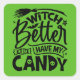 This Halloween-themed design features the playful phrase "Witch Better Have My Candy" arranged in a dynamic, mixed-font layout. The word "Witch" is displayed in bold, blocky letters, while "Better" is written in a cursive, flowing script, adding a sense of urgency and fun to the design. The phrase "Have My" is enclosed within a banner, further emphasizing the demand. The word "Candy" stands out at the bottom in large, block letters, with small skull illustrations integrated into the design. Additional Halloween elements, such as a witch's broomstick, a bat, a star, and wrapped candy, are scattered throughout the composition, enhancing the spooky and festive feel.