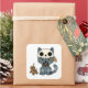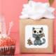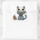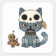 Angry looking cat with tattoo markings, bone necklace, and a skull on top of its head is sitting beside a voodoo doll with pins.