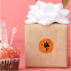 Evil witch flying on a broom stick Halloween stickers. Orange and black stickers and envelope sealers. Spooky design with full moon, bats and black cat.