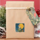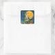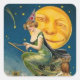 A very pretty witch is flying past a large Harvest Moon on her broom. There is an owl on the broom with her. She appears to be dressed in colourful party clothes and a very not traditional hat for a witch. The sky is bright with stars and the moon seems to be admiring the lovely sight before him.