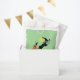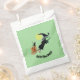 Fun party paper favour bags featuring a colourful original illustration of a witch flying past a full moon on a broom with a black cat and a Jack-o'-Lantern. Lots of Halloween party fun! Green background.