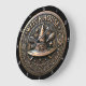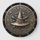 This round wall clock features an intricate, metallic-looking design with a central witch's hat and crossed brooms, surrounded by ornate swirls and stars. Pentagrams are incorporated into the border, framing the bold "WITCH HOUSE" text. The dark, mystical aesthetic is perfect for adding an enchanting touch to your home, especially during Halloween.