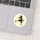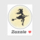Image of a witch silhouette riding a broomstick in front of a glowing moon.  The witch has long hair blowing in the wind, a pointed witch's hat, dressed in a skirt and high heel shoes.