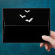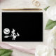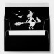 Stylish and minimal black and white Halloween design featuring Destei's silhouette of a long hair witch woman flying on a broomstick. The witch is wearing a long dress, high heel shoes and a witch's hat. The moon is shining behind the witch and there are three bats flying over it. A cat sits on the front of the broomstick.