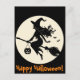 Witch on a broomstick Halloween postcard. Send this postcard flying through the post in the night sky as the full moon shines bright in time for the spookiest night of the year to wish all your friends and family a Happy Halloween, with customisable text to add your own greeeting.