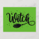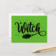 This black-and-white design features the word "Witch" in a bold, flowing script font, with the tail end of the letter "h" transforming into the handle of a broomstick. The text is stylised with a playful, handwritten look, adding a whimsical touch to the overall theme. Surrounding the word are scattered stars, creating a magical, starry-night effect that enhances the witchy theme. The broomstick, positioned diagonally under the text, adds a dynamic element to the design, suggesting movement and adding depth.