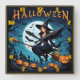 A mysterious witch rides her broomstick under a full moon, surrounded by bats and glowing pumpkins, capturing the essence of Halloween magic.