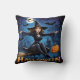 A spirited witch gracefully rides her broomstick, soaring above a mysterious town adorned with bats and a glowing pumpkin under a full moon.