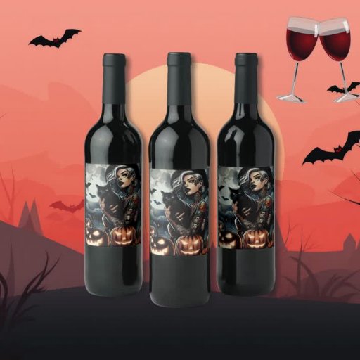 Halloween party gift bag. Grab your broom and fly over! Spooky gothic tattooed witch with a black cat, bats and full moon graphics.