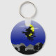 Wicked witch Halloween key ring party favour. A yellow crescent moon hangs over a sleepy little town where a witch silently glides overhead on her broomstick.
