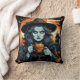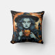 A formidable witch stands with a glowing cup, surrounded by jack-o'-lanterns and an eerie backdrop of bats and a haunted castle under a full moon.