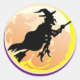 Black silhouette of a witch flying off into the sky on her broomstick caught in the glow of Halloween night.