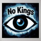 This striking poster centres on a captivating evil eye, painted with a mesmerising gradient of blues and blacks that draws you in like a modern-day oracle. The eye's gleam is sharp and precise—an emblem of clarity, insight, and vigilance. Above this all-seeing gaze, the commanding phrase “No Kings” challenges the status quo, breaking outdated power structures with a rebellious spirit. The sharp contrast between the deep black text and the illuminated swirl of blues surrounding the eye infuses the design with urgency and dynamism. Finished as a oil paint art print.