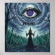This poster presents a philosophical exploration of power, authority, and perception through the depiction of a large eye suggesting omniscience, reminiscent of the "Eye of Providence." Below, a solitary figure in dark robes represents a witch or sorcerer, commanding a storm, symbolising a clash between individual will and external forces. The phrase "NO KINGS" rejects hierarchical authority, advocating for decentralised ideals. Artistic contrasts between light and shadow reflect turmoil and the struggle for self-determination, prompting contemplation of who watches, commands, and resists in the context of authority.
