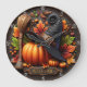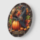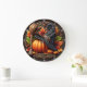 This festive clock features a detailed autumn scene with a large, black witch's hat placed on top of a pumpkin. A broom is propped up against the pumpkin, and the scene is decorated with various autumn leaves, berries, and smaller pumpkins. The clock face is set against a dark wooden background, with a banner at the bottom that reads "WELCOME". The clock hands are black and the numbers are stylised in a festive font, all framed by a wooden border.