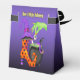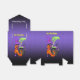 Witchy Halloween Favour Box that features a bright Purple and Black gradient background with a Green witch's hand holding an eyeball over a cauldron of bubbling witches brew.In front of the witch cauldron there is a bright orange witch boot and a purple witch hat. Text is Spooky Halloween Wishes 20XX. All text is customisable, you can add text, delete text, change font, text colour, move text, etc. Witchy Halloween Gift Box are great for your Halloween party favours! If you need help customising this product, please contact me through my store and I'll be happy to help! Matching party supplies and party favours are also available in our shop.