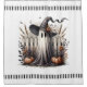 A whimsical ghost in a pointed witch’s hat stands beside a white picket fence, surrounded by pumpkins, golden leaves, and bursts of fall foliage. Black birds soar overhead, adding motion to the serene scene, while the warm tones of autumn ground the composition in seasonal comfort. It’s a charming blend of Halloween mischief and harvest beauty—where the supernatural meets the soft glow of October afternoons.