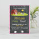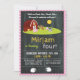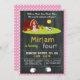 Printable farm birthday invitation set on a farm with animals in front of a farm house bounded by a fence on a chalkboard background.
