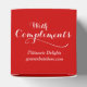Give a taster professionally to customers with this simple red and white with compliments gift or treat gift box. Ideal for corporate gifts for clients or employees. Could also be used for promotions or loyal or potential new customers filled with your food samples. A simple black and white coffee bean style interlinking ovals gift box. Customise with your companies contact details. Currently reads with compliments pâtisserie delights followed by phone number or your website. Designed by Sarah Trett.