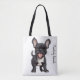 a delightful tote bag that showcases the embodiment of cuteness in the form of a charming, cartoon-style black French Bulldog puppy with a distinct white patch. The canvas of the tote bag is a clean and neutral colour that provides the perfect backdrop to make the puppy's features pop.