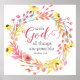 Typography design with caption in white letters, "With God All Things are Possible.” Design is centred inside colourful watercolor floral wreath. Bible verse is from Jesus' words in from Matthew 19:26.