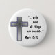 White button with black print, With God all things are possible bible verse. A picture of a grey cross is next to the bible quote.