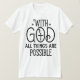 This stylish and faith-affirming apparel design features the powerful inspirational quote, "WITH GOD ALL THINGS ARE POSSIBLE." The message is rendered in high-contrast black typography against a clean white T-shirt background, creating a clear and impactful declaration of belief. The design uses a mix of bold, hand-drawn, and playful script fonts, with the word "GOD" being the largest and most prominent. The letter 'O' in 'GOD' is cleverly replaced by a stylized cross graphic, emphasizing the central role of Christ in making things possible. The text is framed by small decorative stars and flourishes, adding a gentle, appealing touch. This versatile T-shirt design is a perfect way to express unwavering faith, hope, and conviction, serving as a public reminder that nothing is impossible with God. It is ideal for casual wear, church events, or as a thoughtful, meaningful gift for anyone seeking spiritual encouragement and motivation.