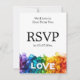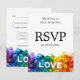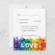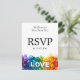 This is a beautiful vertical RSVP card from the Painted With Love LGBTQ+ Wedding collection. It features a striking design with rainbow-infused brushstrokes at the bottom, creating a vibrant base for the bold, white word "LOVE." The back of the card, designed to be fully customisable, prominently says "We'd love to Hear From You" and "RSVP" followed by the deadline.