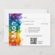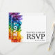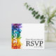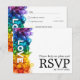 This beautiful RSVP enclosure card is part of the Painted With Love LGBTQ+ Wedding collection. Designed to complement the wedding invitation, the horizontal card features a vibrant cascade of rainbow-infused brushstrokes flowing down the left side, with the word "LOVE" boldly placed vertically to catch the eye. The back of the card is designed for your guests to easily respond. It provides a line for them to write their name, followed by checkboxes to indicate if they will "accept with pleasure" or "regretfully decline" and a space to specify the number of guests. A key feature of this card is the option for guests to select their meal choice from a customisable list, such as "grilled salmon with lemon-dill sauce," "filet mignon with red wine reduction," and "vegetarian stuffed bell peppers." Additionally, the bottom of the card includes a QR code that guests can scan to reply online, making the RSVP process simple and modern. The back of the card keeps it simple with the text, "Please help us plan and RSVP," followed by the response deadline date clearly marked at the bottom.