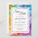Introducing the "Ethereal Bloom Collection" save-the-date card, offering an elegant preview of the vibrant artistry that will surround your forthcoming celebration. The front of this card showcases mesmerising alcohol ink artwork in swirling hues of blues, purples, reds, oranges, and greens, with ethereal double-exposed lilies framing the design. The gentle caption "Save the Date" is followed by the couple's names, wedding date, and location, all elegantly presented to set the perfect tone for your special day.