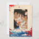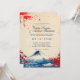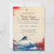 Behold the "Eternal Harmony" wedding invitation, a masterful blend of vintage Japanese charm and timeless elegance. The front side captures the majestic beauty of Mount Fuji, standing tall in tranquil blue and white hues, surrounded by delicate waves, symbolising peace and natural splendour. The soft beige and cream tones of the background, enhanced by artistic red brushstrokes, evoke the spirit of classic Japanese ink wash paintings.