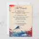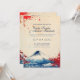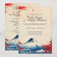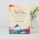 Behold the "Japonesque Harmony with Fuji" wedding invitation, a masterful blend of vintage Japanese charm and timeless elegance. The front side captures the majestic beauty of Mount Fuji, standing tall in tranquil blue and white hues, surrounded by delicate waves, symbolising peace and natural splendour. The soft beige and cream tones of the background, enhanced by artistic red brushstrokes, evoke the spirit of classic Japanese ink wash paintings.
