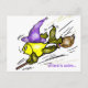 Funny adorable and cute gift, Sparky the yellow fish wearing a purple wizard hat with stars and flying on a broom.In the sky version - sparky in flying in the sky next to a air-plain's wing with a beautiful island and sea scenery underneath.Ideal gift to any Magic / Halloween fun :)
