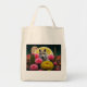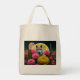 The printing came out very well, better than I had anticipated. The natural color fabric is sturdy with strong seams and comfortable handles. This tote fits easily over my shoulder. As it is filled, the bottom flattens out--very cool! I would buy this product again. This grocery tote holds a lot of groceries! The image quality was very good. The colors were a little darker than I had expected. The darkness may have been due to printing on a natural color fabric rather than on white. The cat design is attractively centered on the tote. The spirit of the design is very lively, just as it appears on the Zazzle website.