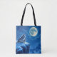 Wolf tote bag. An illustration with wolves howling at the full moon on a cold winter night standing upon a cliff.