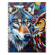 A vibrant colourful ai illustration of a wolf and an owl in a mosaic stained glass effect. A nice notebook for those who love wildlife.