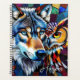 A vibrant colourful ai illustration of a wolf and an owl in a mosaic stained glass effect. A nice planner for those who love wildlife.