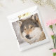 Animal, wildlife, wild, lumberjack themed birthday party. Photo of a wolf head. A friendly looking wolf with a smile on it's face. It's winter with a white snowy background. For a boy's 7th (or any age) birthday party. Personalise and add the kid's name, black letters.