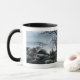 Two Wolves sitting amongst rocks outside of a castle. Mountains all round.