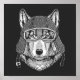 This design features a wolf wearing a vintage motorcyle helmet.