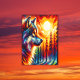 Stunning wolf face with the sun shining brightly in the background in the forest in a colorful design. Perfect for home, office or present. Window Cling.