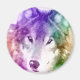 Colourful digital art rendering of wolf face.