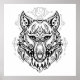 Wolf head front view with ethnic decorations and spiritual symbols of the moon and arrows. Predator front view portrait with curls and tribal ornaments.