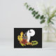 A wolf howling up at a full moon with autumn leaves and acorns against backdrop of black