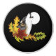 A wolf howling at a full moon with autumn leaves and acorns in a backdrop of black.