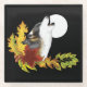 A wolf howling at a full moon with autumn leaves and acorns against a backdrop of black.