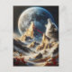 A wolf howls at the moon in a fantastical landscape of snow-capped mountains and glowing orbs. The large, blue moon fills the sky, casting an ethereal glow over the scene.