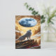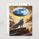 A white wolf stands on a rocky outcropping, howling at a large, blue moon in a fantastical, swirling landscape. The image evokes a sense of mystery and wild beauty.
